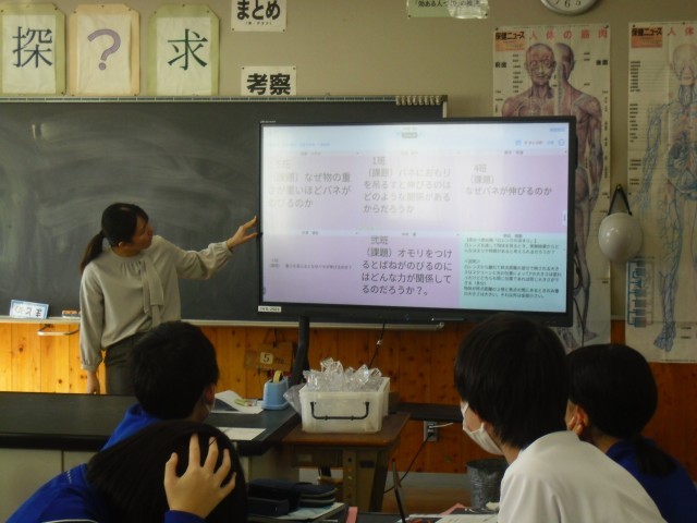 おもりをつけるとバネが伸びる現象を見て、学習課題を考えました。「なぜ?」を大切にした授業を進めています。