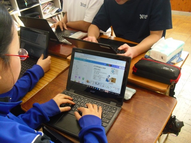 発表会に向け、防災学習で学んだことをスライドにまとめています。