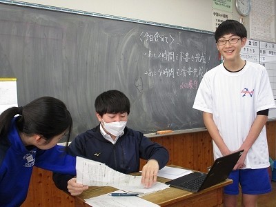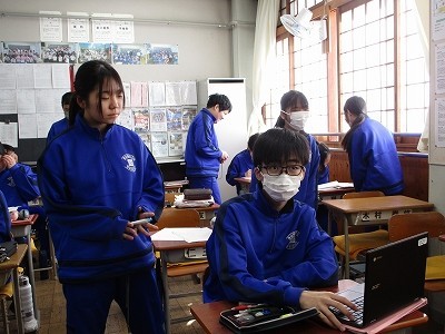 卒業文集づくりをしています。もちろん、英語でです。中学校での英語学習の集大成として、学んできた英語の力を発揮しながら、仲間への感謝を伝えたり、自分のことを振り返ったりしています。先生が一人一人の進捗状況や内容を確認して助言をしながら進めています。
