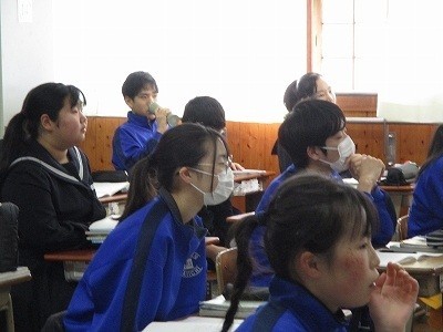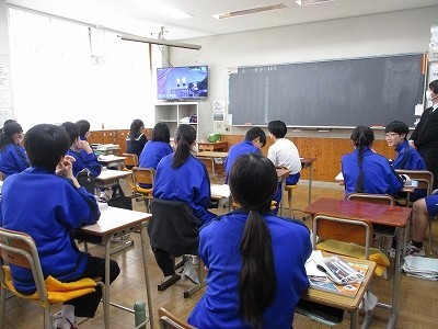 授業の導入の場面です。エネルギーについての動画を見ています。電気のない地域でも人々はスマートフォンを持っていること、発電の方法にはさまざまなものがあることなどを知りました。これだけ情報化が進んでいる世の中では、エネルギーはなくてはならないものです。