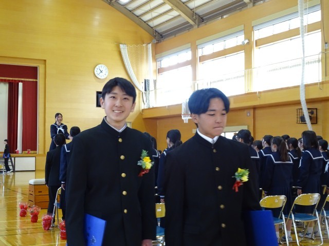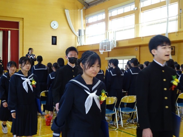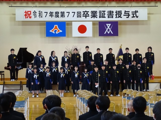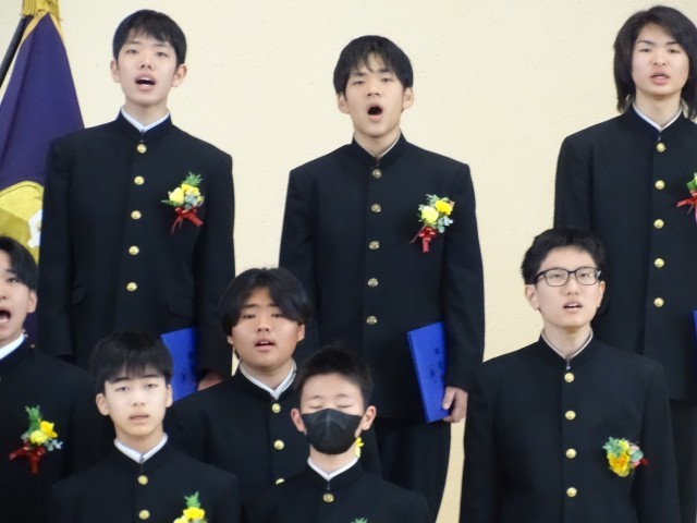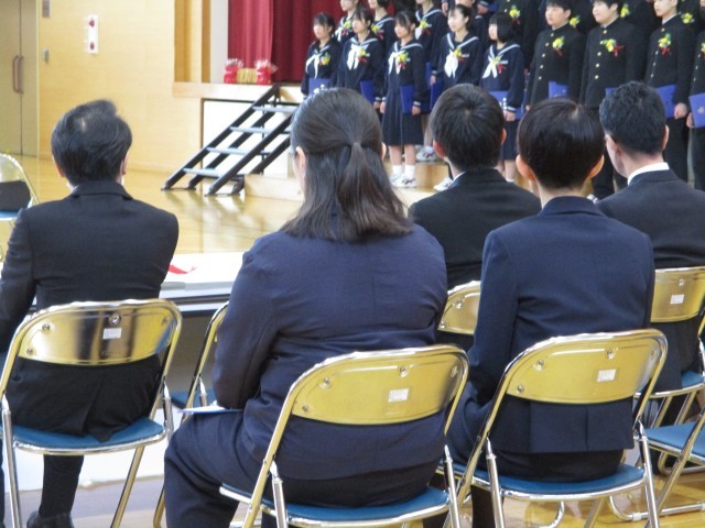 卒業記念合唱です。この仲間との最後の合唱。合唱を聞いている3年担当の先生方の後ろ姿、これまでのいろいろな出来事を思い出しているのでしょうか? 別れる寂しさと、大きくなったな、成長したな、といううれしさがにじみ出ています。