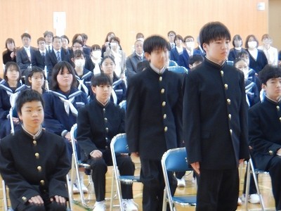 新入生35名を迎え、入学式が行われました。担任の先生の呼名に、力強く「はい!」と返事をする姿に、中学校の生活を頑張るぞ!という決意を感じました。そして今年の入学生は、第一小、線本小最後の卒業生であり、第一中最後の入学生でもあります。学校が変っていく節目という経験をぜひチャンスと捉え、新しい学校をともに創っていって欲しいですね。