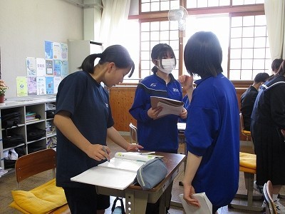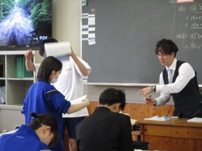 式の計算です。問題を解いて、先生に見てもらったり、友達同士で確認し合ったりしていました。