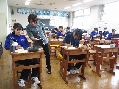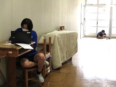 鑑賞の授業です。Chromeブックに先生がアップしてくれた音源を聞く場所がみなそれぞれ。音楽室の自分の席、椅子を机にして教室の後ろで、廊下で、ホールで・・・。