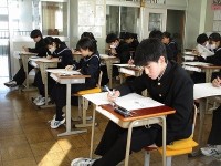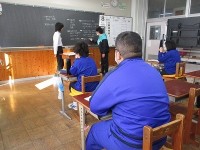 道徳の教材に出てくる、視覚障がいの方の気持ちを理解するため、1Aの生徒が疑似体験を行っていました。目をつぶって歩くということはとても不安で、生徒達は、相手の身になって考えようという気持ちになっていたようでした。