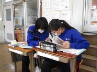 2年生の理科の授業です。「いろいろな化学変化」について学習しています。今日の学習課題は、「『燃える』は化学変化か?」でした。班ごとに考えを発表し合っていました。