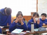 1年生の音楽の授業です。校歌を歌う声が聞こえたので、写真を撮りに急いで行ったのですが、間に合いませんでした。音楽記号の学習をしていました。