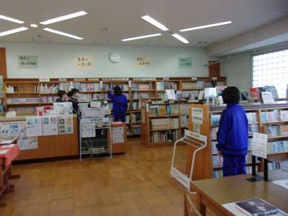 昼休みの図書室の様子です。今日は図書館支援員さんが来てくださっています。読みたい本を探している生徒がたくさんいました。