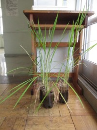 2年A組教室前に、ペットボトルを利用して稲が育てられています。そして、稲穂ができ...