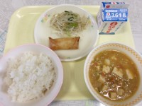 今日のメニューは、ごはん、牛乳、春巻き、塩ナムル、麻婆豆腐です。