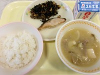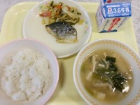 今日のメニューは、ごはん、牛乳、鮭のこうじ焼き、ひじきと大豆の煮物、豚汁です。