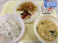今日のメニューは、筍ごはん、牛乳、黒はんぺんのお茶フライ、もやしのごま和え、じゃ...