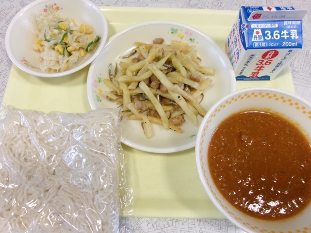 今日のメニューは、ソフトめん、牛乳、ミートソース、ポテトと大豆の唐揚げ、サラダのごまドレッシング和えです。