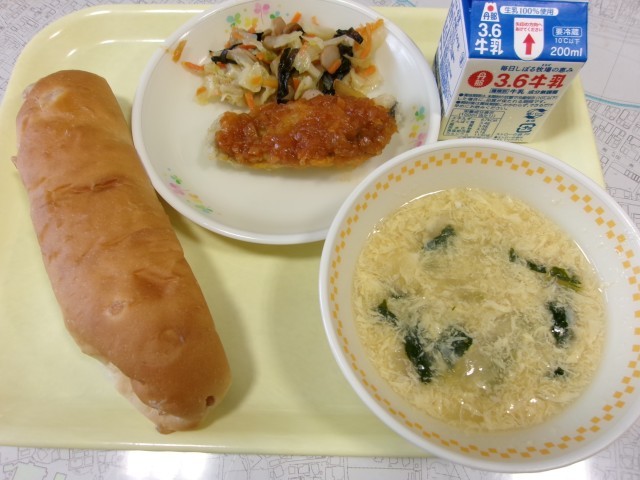 今日のメニューは、りんごロールパン、牛乳、ホキのチリソースがけ、ウインナーときくらげのソテー、卵のスープです。