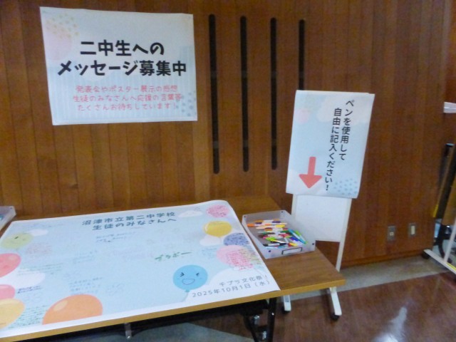 千本プラザ内には生徒作品を展示するコーナーも設けられました。二中生へのメッセージコーナーには、地域の方々から温かいメッセージが寄せられていました。生徒の思い出に残る松かげ祭文化の部になったと思います。地域のみなさま、千本プラザのみなさま、保護者のみなさま、支援していただいた全てのみなさま、ありがとうございました。