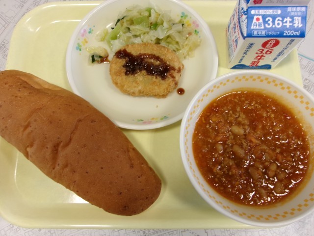 今日のメニューは、玄米ロールパン、牛乳、チリコンカン、野菜コロッケ、キャベツのドレッシング和えです。