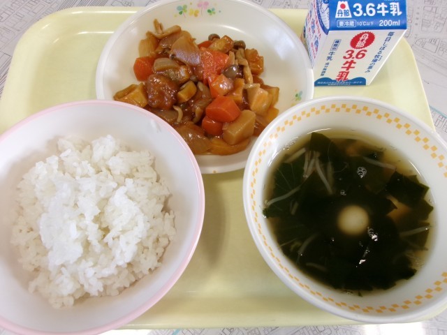 今日のメニューは、ごはん、牛乳、酢豚、わかめスープです。