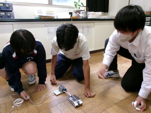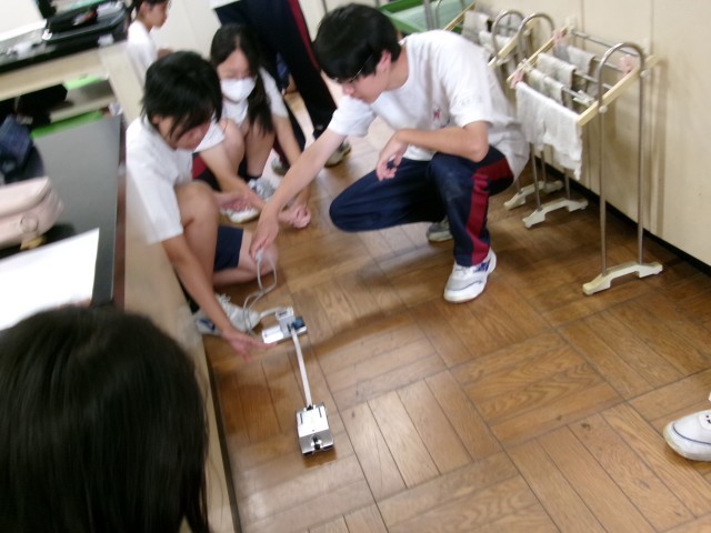 速さが変化しない運動について、グループに分かれて実験していました。力の加え方にコツがあるようです。