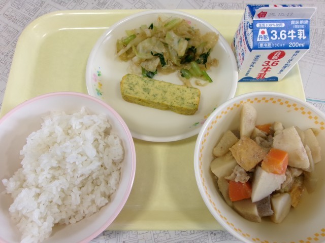 今日のメニューは、ごはん、牛乳、芋煮、海苔入り厚焼き玉子、キャベツのお浸しです。