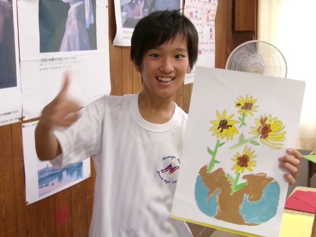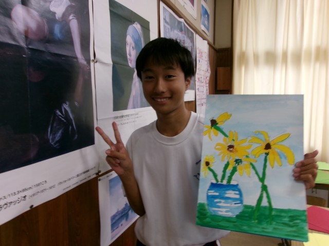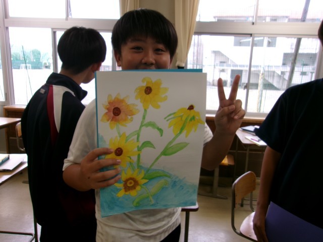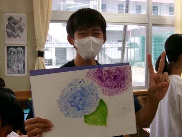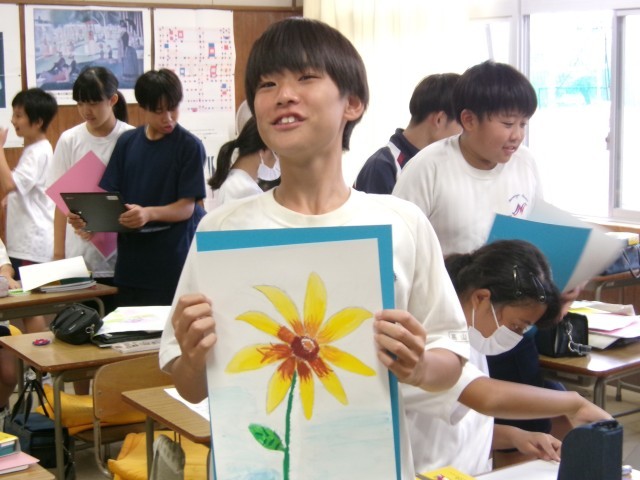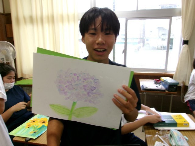 「花」をテーマにした水彩画が完成しました。上手に描けた男子が作品を見せてくれました。