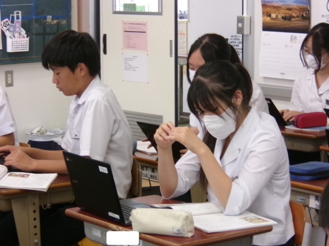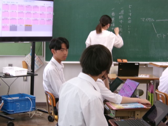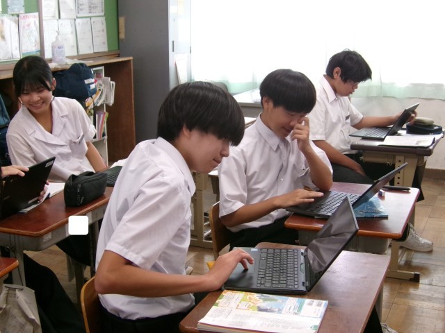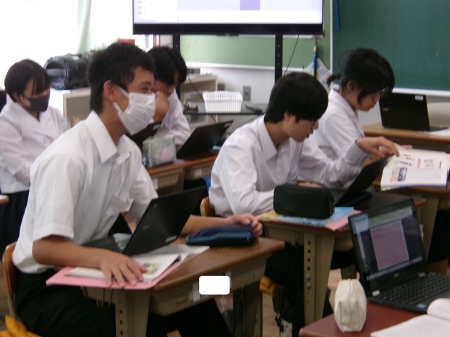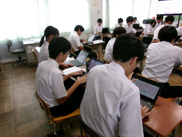 資料を読んで、自分の考えをChromeBookを使ってまとめたり、仲間の考えを共有画面で確認したりしているところです。