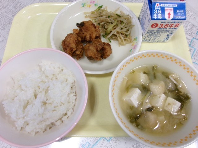 今日のメニューは、ごはん、牛乳、鶏肉の塩こうじ揚げ、もやしのごま酢和え、具だくさんみそ汁です。