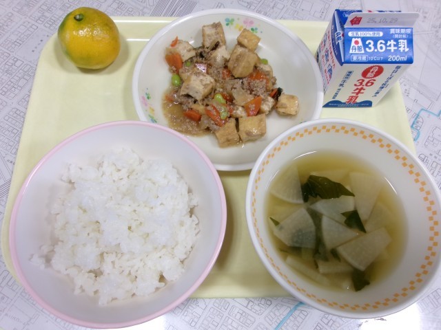 今日のメニューは、ごはん、牛乳、厚揚げのそぼろ煮、さつま芋と大根のみそ汁、果物(みかん)です。
