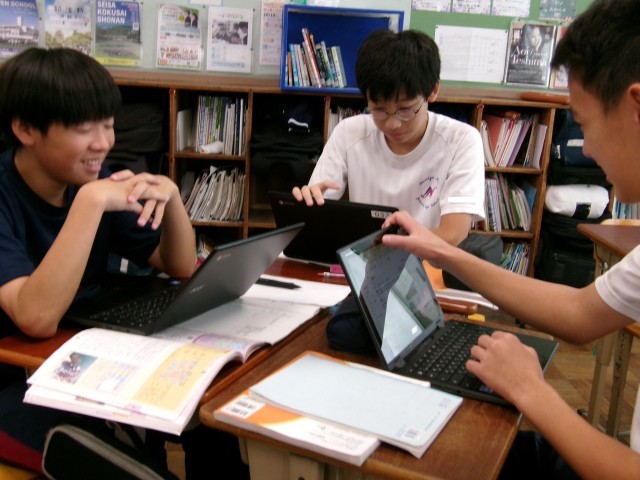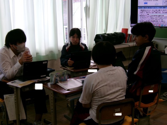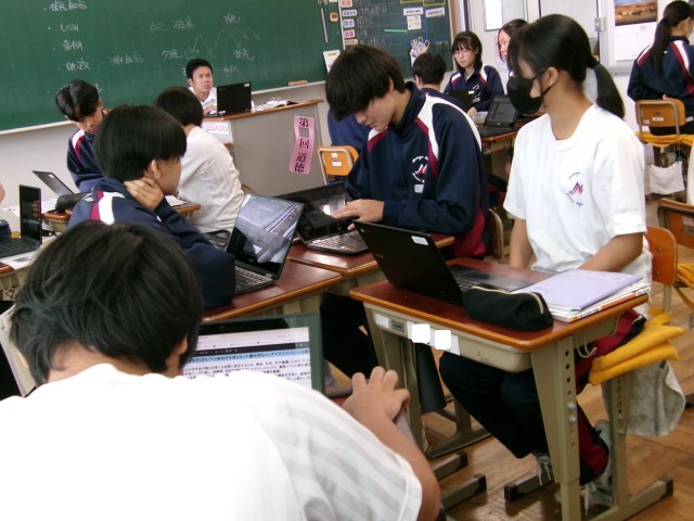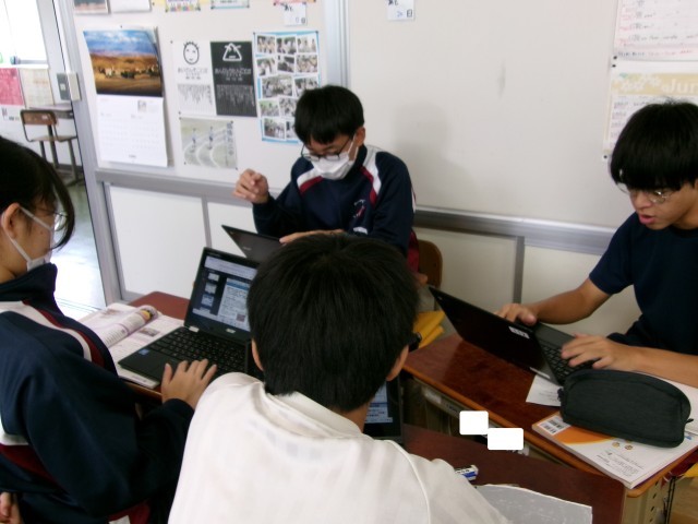 「地方自治」特徴的な取組を行う市町を個人で調べ、グループの仲間に発表していました。