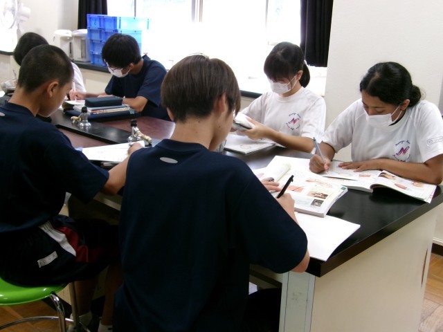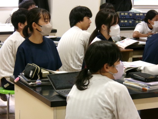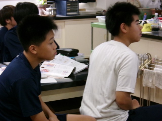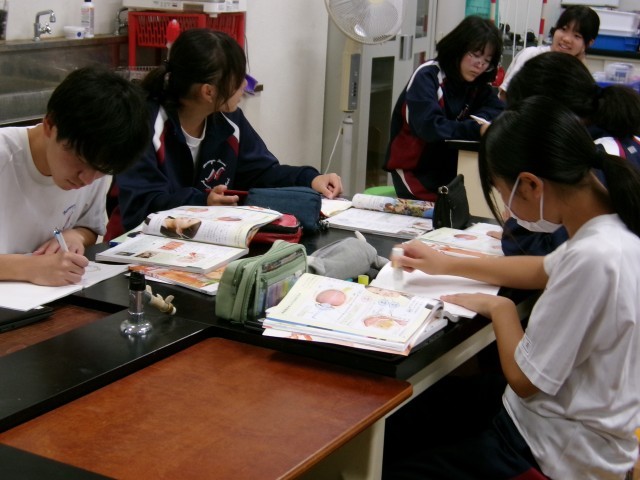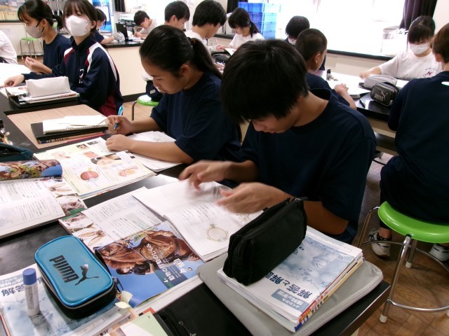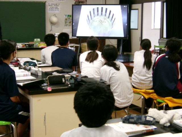 「動物の行動のしくみ」ヒメダカが刺激をどこで感じているか調べた実験の映像を食い入るように見ていました。その後、教科書で「刺激」や「感覚器官」という言葉を確認したり、ヒトの感覚器官について発表したりしていました。