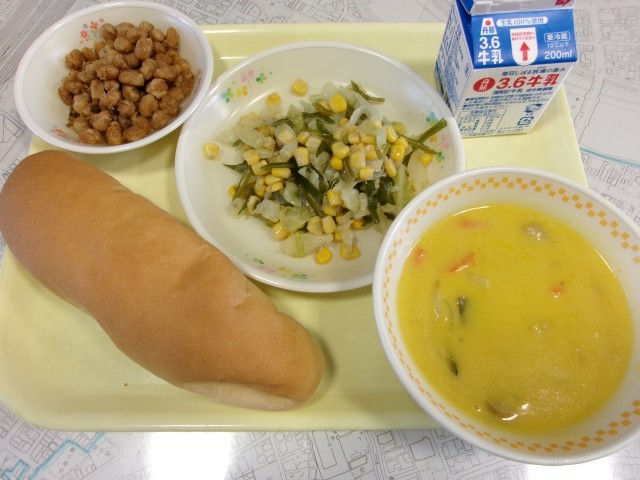 今日のメニューは、ロールパン、牛乳、クリームシチュー、ごまきなこ豆、茎わかめのサラダです。