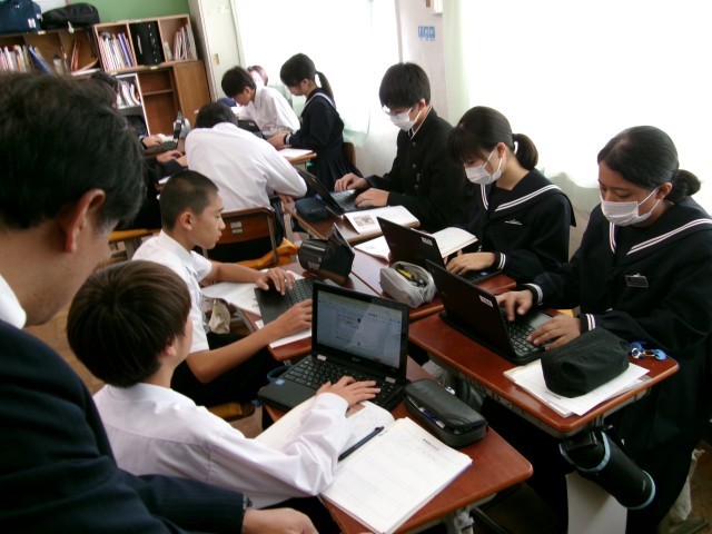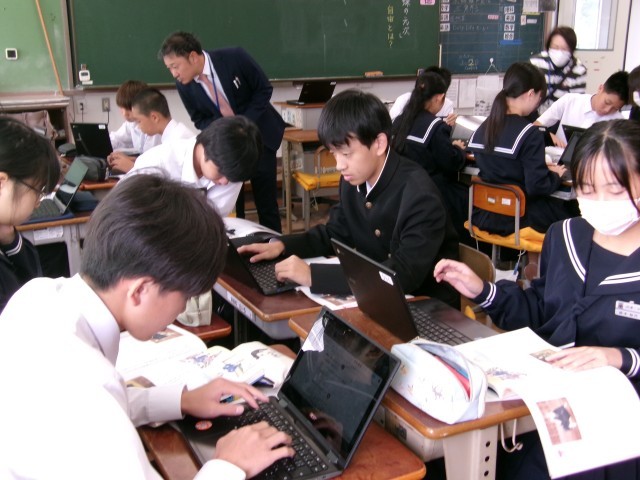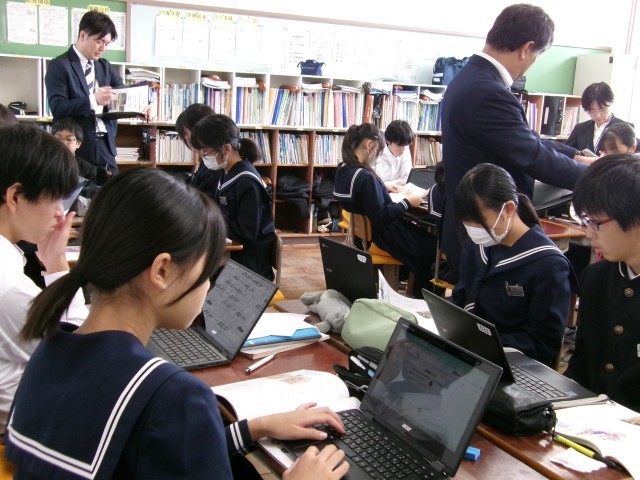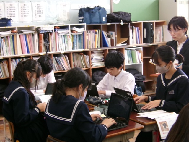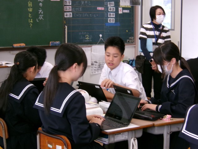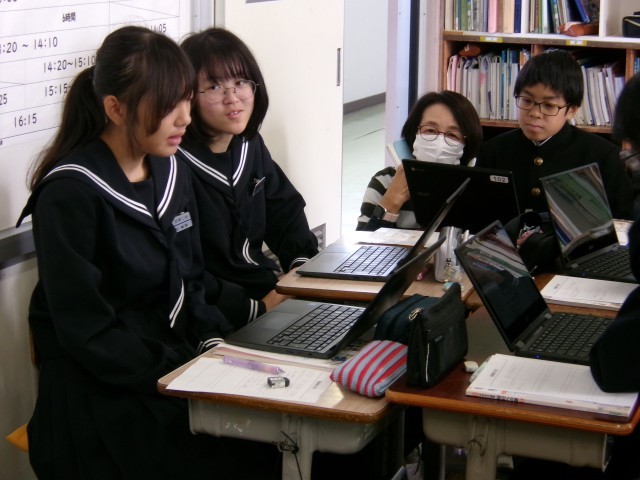教科書の「黒蜘蛛の元次」を読んで、二人の登場人物の生き方について、グループで意見を述べ合っているところです。