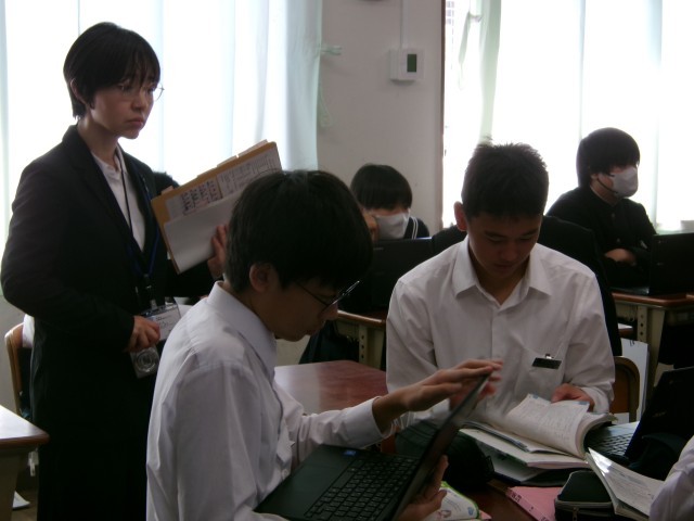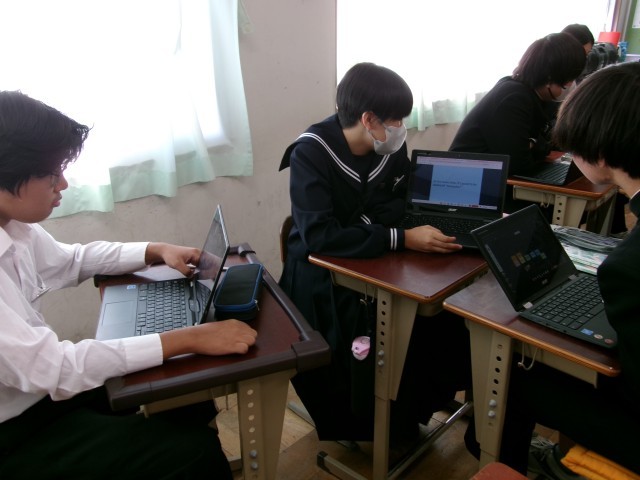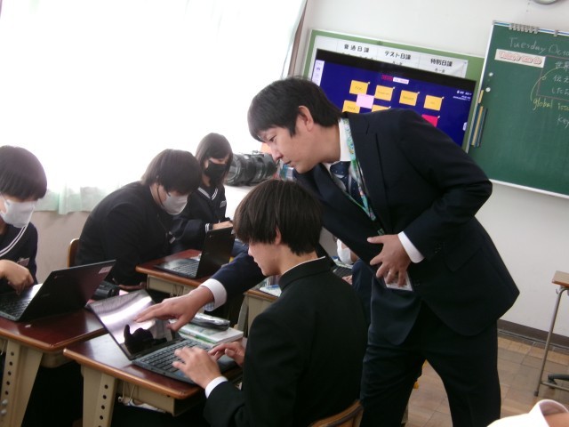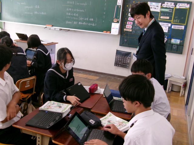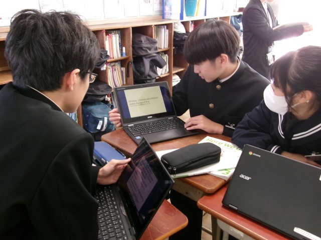 世界の課題について、グループの仲間に、自分の意見を英語で伝えています。