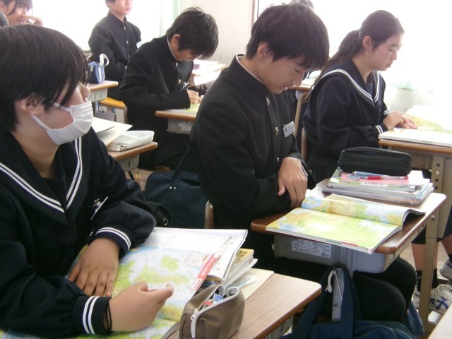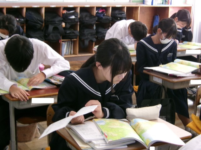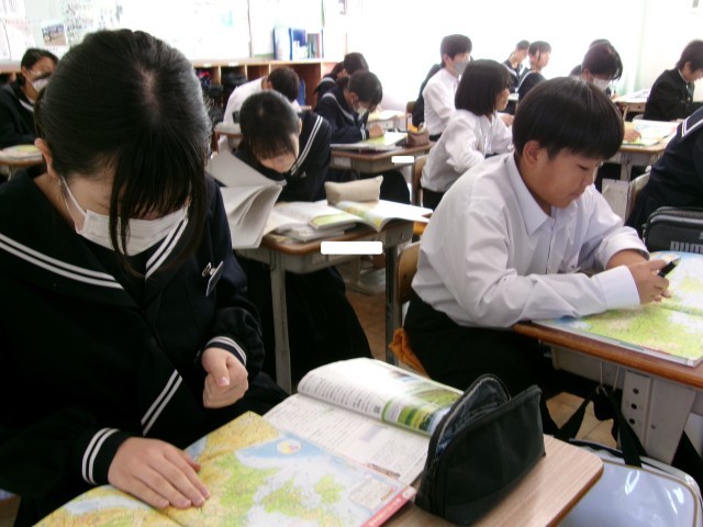 地図帳を見ながら、EUの国々の学習のまとめをしていました。仲間がつぶやいた都市の場所を、素早く見つけられるように目をこらしています。