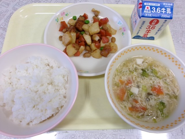 今日のメニューは、ごはん、牛乳、白身魚とじゃが芋の揚げ煮、レタスと卵のスープです。