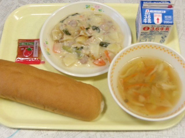今日のメニューは、ロールパン、いちごジャム、牛乳、チキングラタン、ベーコンと野菜のスープです。