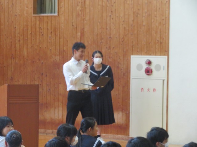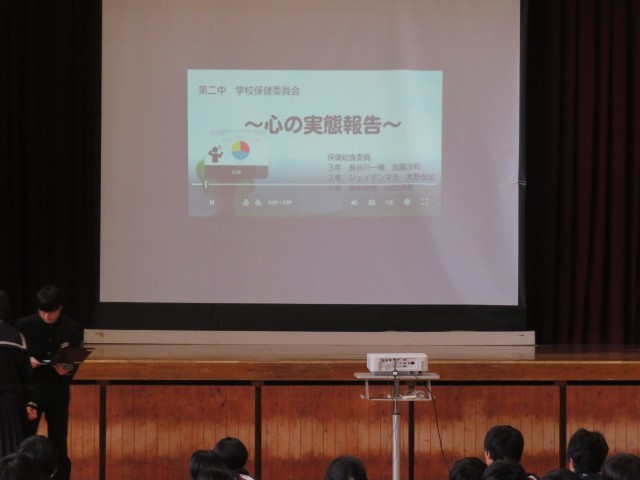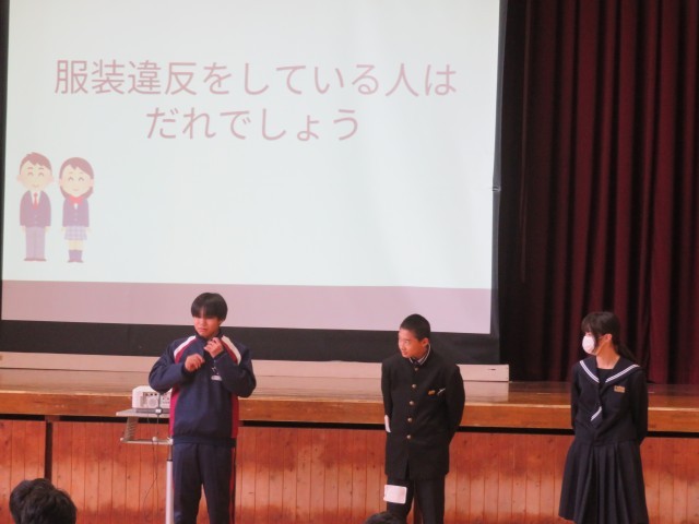 生徒会からは、後期生徒会スローガンについて、生活委員会からは、冬服の着方について、保健給食委員会からはピアサポートについての発表を行いました。