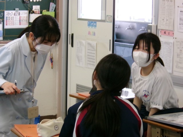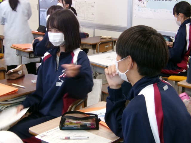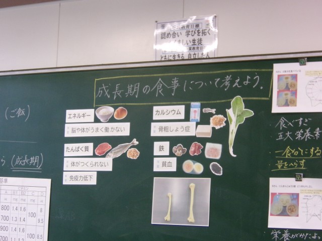 担任と栄養教諭の二人の先生による食育の授業の様子です。「成長期の食事について考えよう」と題して、食事について理解を深めたり、自分の食事について見つめ直したりする機会となりました。