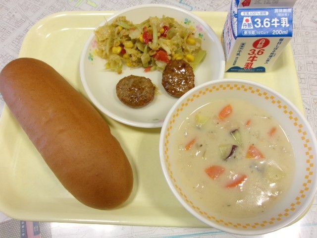 今日のメニューは、黒糖ロールパン、牛乳、いんげん豆のクリームスープ、つくねの甘辛和え、カリフローレとキャベツのソテーです。