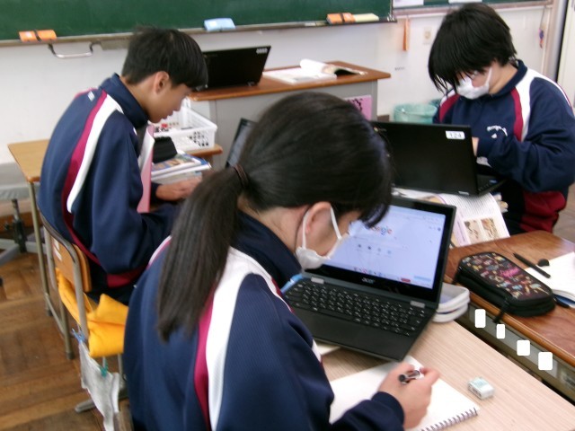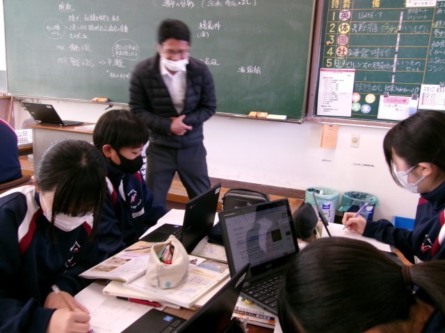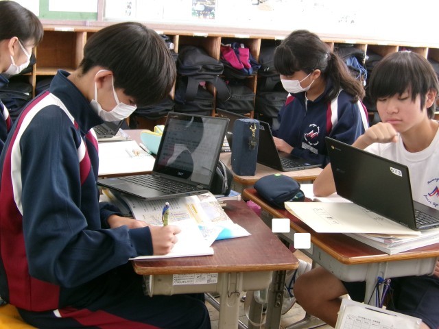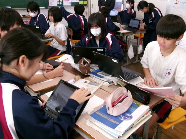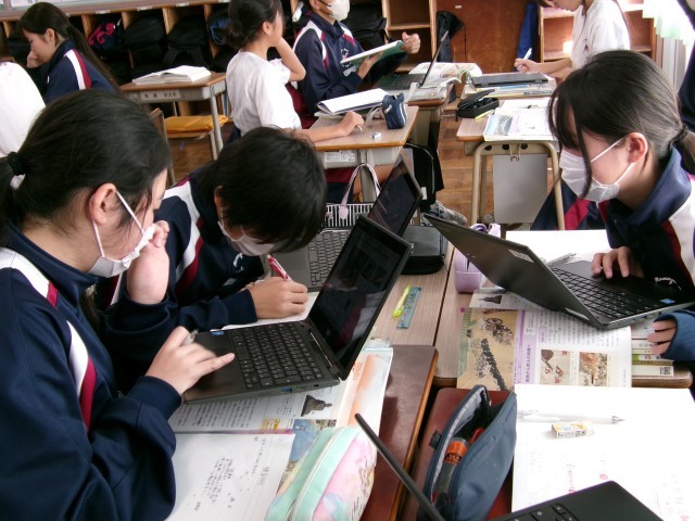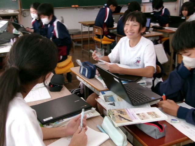 源平の合戦について、個人で調べたことをグループの仲間に発表していました。