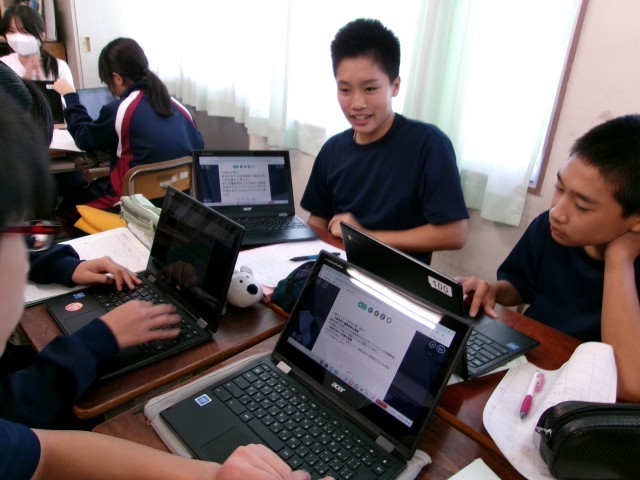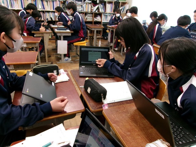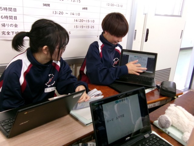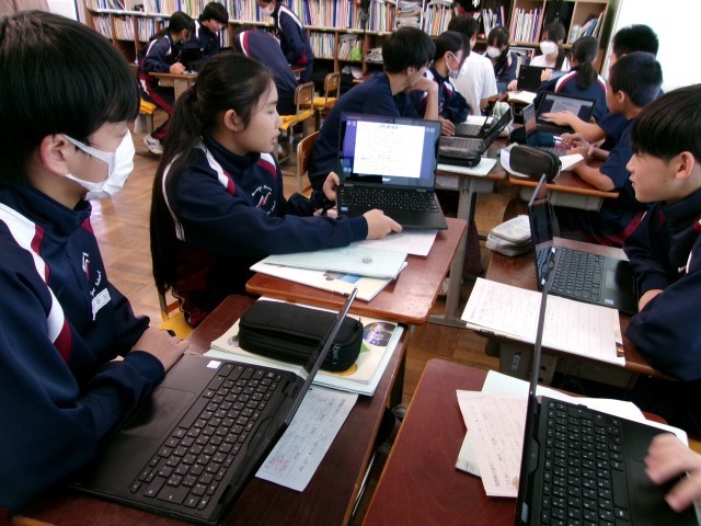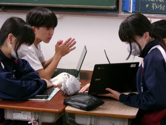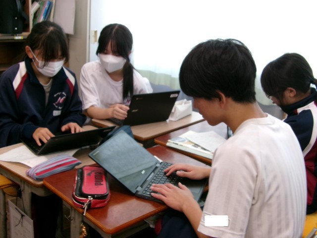 「介護福祉の在り方について考えよう」と題して、個人で調べ学習を進めました。今日はグループの仲間に発表しています。