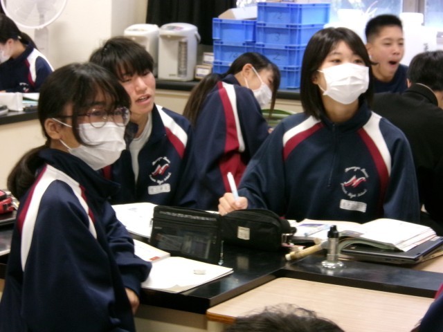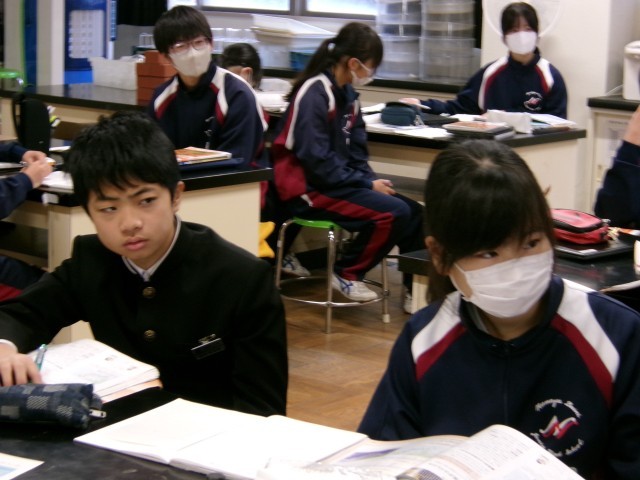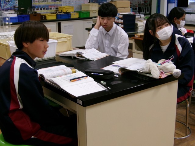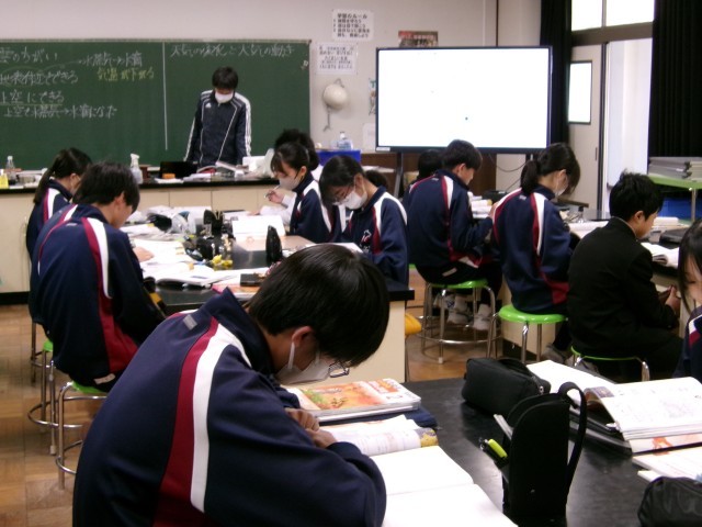 「天気の変化と大気の動き」天気図を見ながら、等圧線について気付いたことを発表したり、先生の説明を聞いたりしているところです。