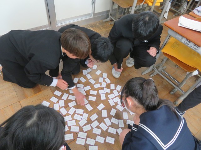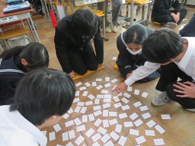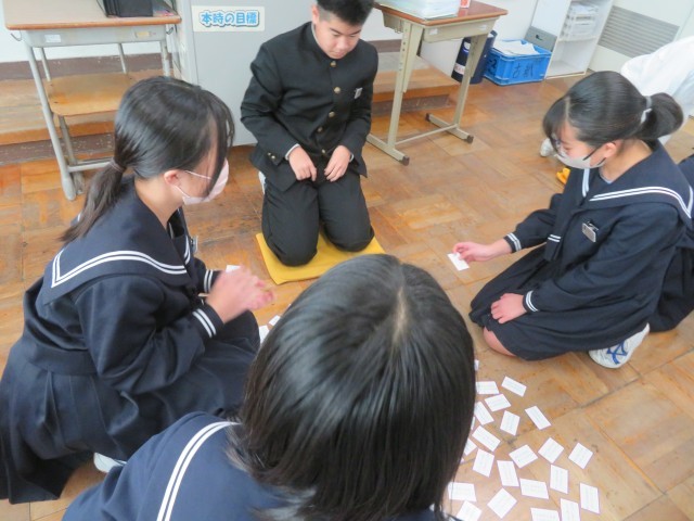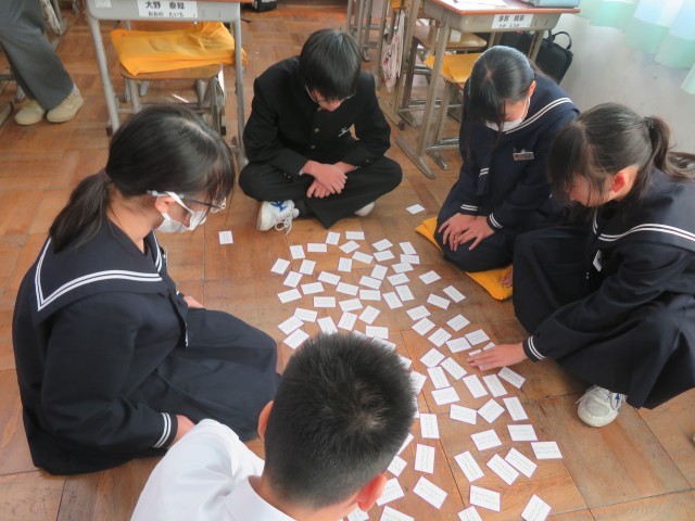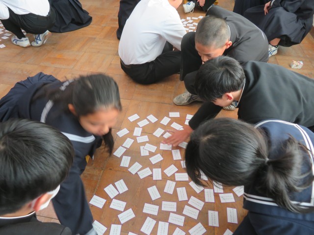 百人一首が始まりました。どのグループも、1枚の札をめぐって大いに盛り上がっていました。