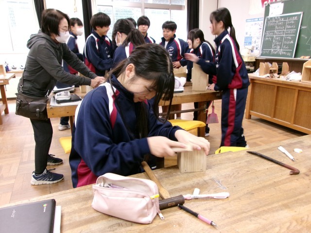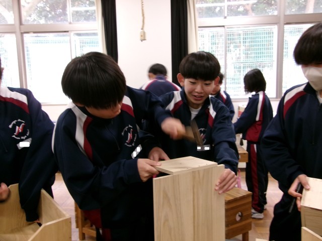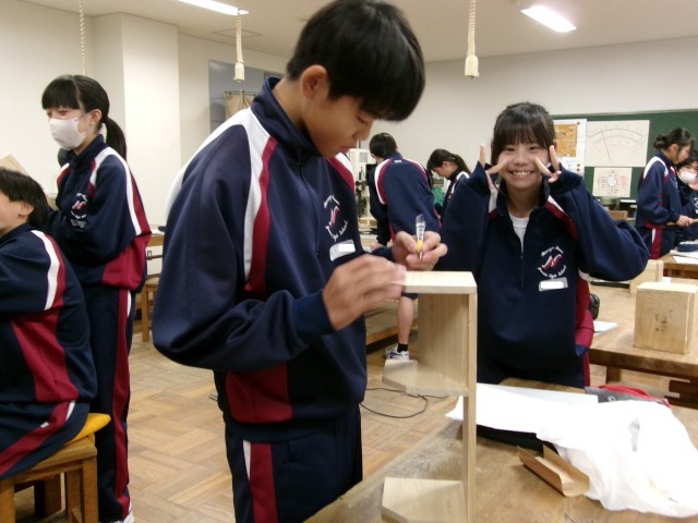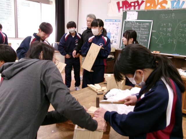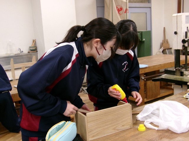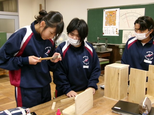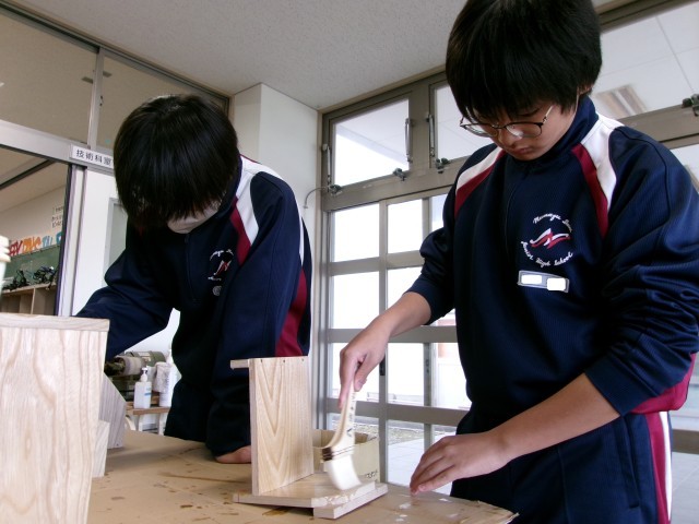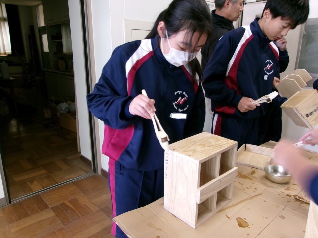 それぞれが設計した木工作品が形となりました。早い人は、仕上げにニスを塗り始めました。