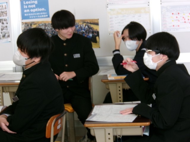 返却された単元テストを振り返り、難しい問題の解き方を確認しています。