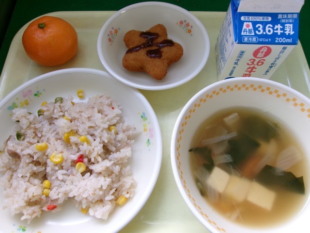 今日のメニューは、ツナピラフ、牛乳、コロッケ、うずら卵と野菜のスープ、果物(みかん)です。