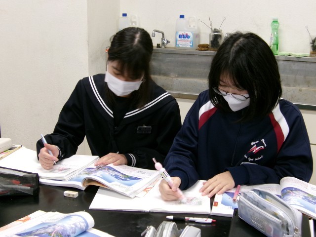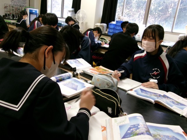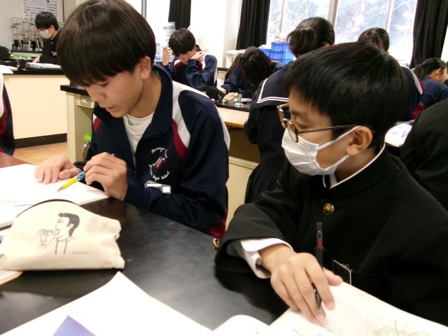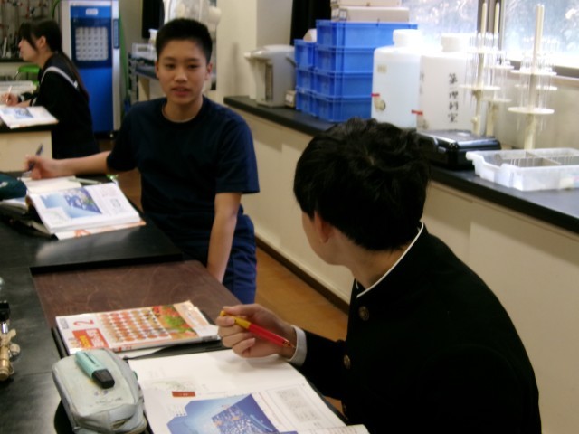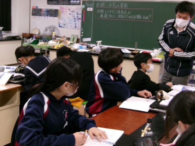 「前線と天気の変化」前線をともなう低気圧が通過すると、天気はどのように変化するのか?学習してきたことを思い出し、仲間と相談しながら考えをまとめていました。