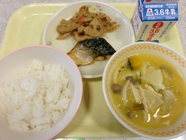今日は冬至献立です。メニューは、ごはん、牛乳、鯖のゆうあん焼き、根菜の炒め物、かぼちゃほうとうです。