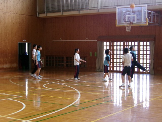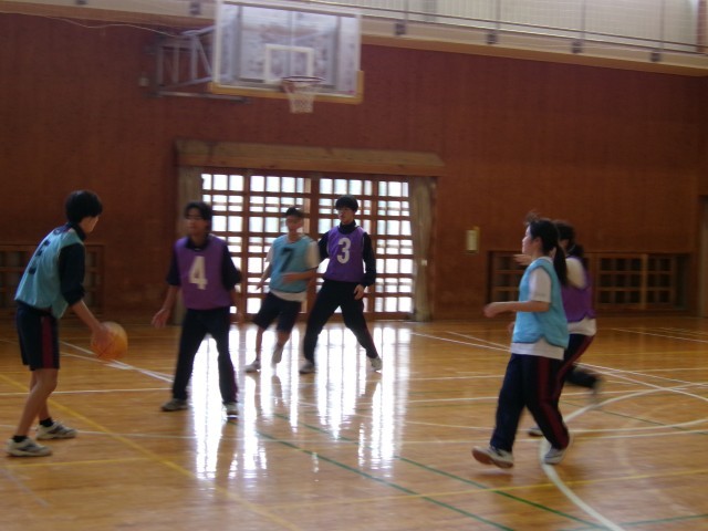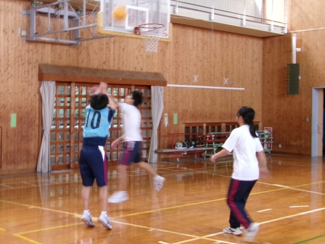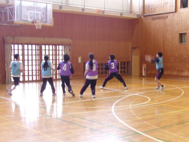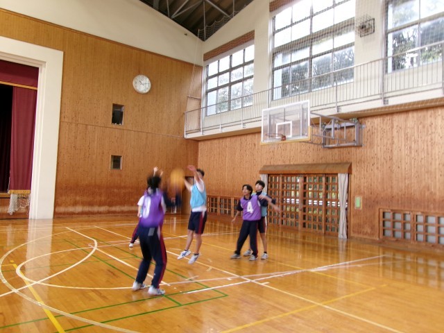 「バスケットボール」ゲーム形式で3対3を行っています。チーム内で声を掛けあい、得点シーンを増やそうとがんばっていました。