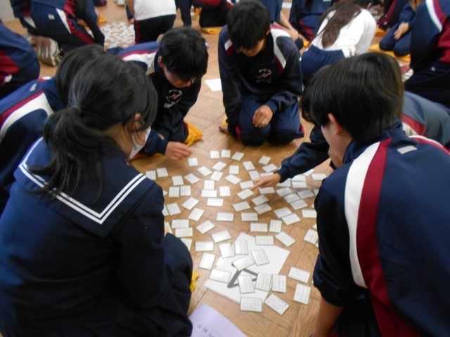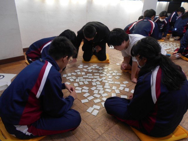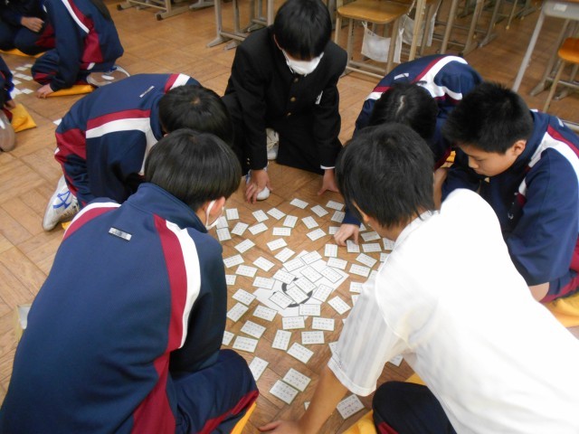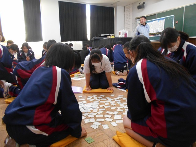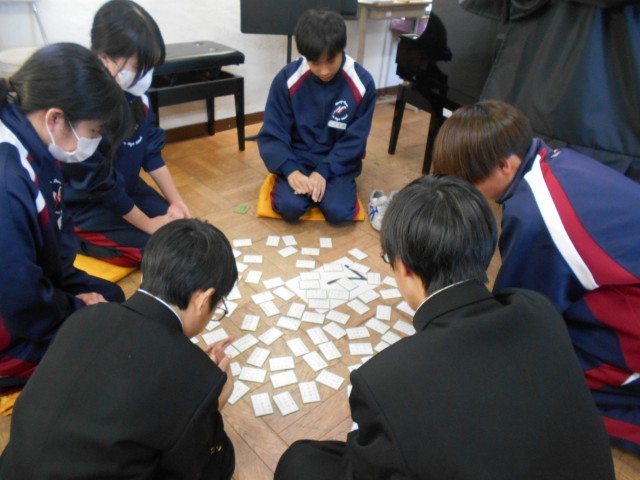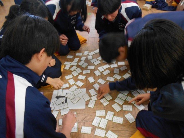 1・2年生交流のグループに分かれ、百人一首大会が実施されました。学年の枠をこえた真剣勝負で大いに盛り上がりました。