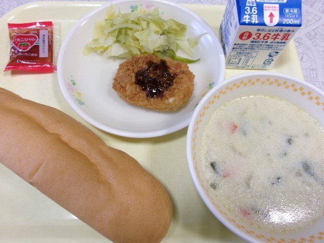 今週は全国学校給食週間です。昭和25年をイメージした今日のメニューは、ロールパン、いちごのジャム、牛乳、野菜のコロッケ、ボイルドキャベツ、ミルクスープです。